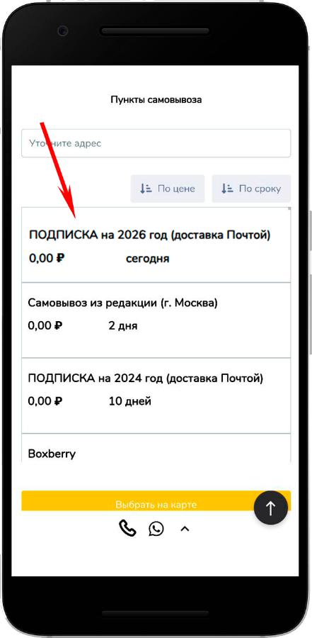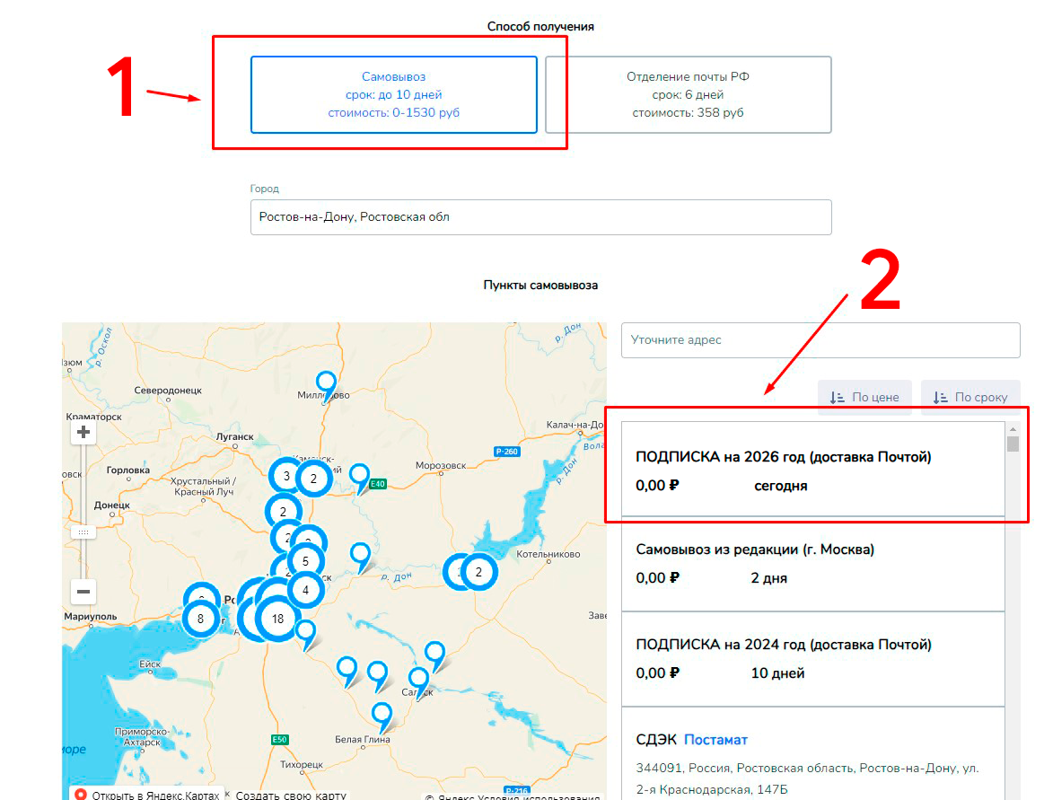 при оформлении заказа выберите способ доставки «ПОДПИСКА на 2026 год (доставка Почтой)». Этот способ появится после того, как прогрузится карта.