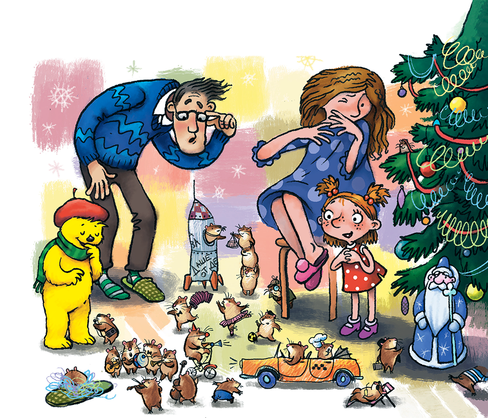 И когда утром первого января Даша вбежала в комнату с ёлкой, там уже были все: мама, папа… и сорок два хомяка. Хомяк-просто-так строил в папином тапке гнездо из мишуры. Хомяк в шляпе и галстуке вёл под ёлкой деловые переговоры с пенопластовой фигуркой Деда Мороза. Хомяк-клоун на трёхколёсном велосипеде ездил по комнате из угла в угол и бибикал клаксоном. Хомяк-балерина в юбочке и пуантах крутился вокруг себя на одной задней лапке – вторая была отставлена в сторону. Хомяк в тельняшке и бескозырке лез по ёлке, словно по мачте. Хомяк-таксист подвозил хомяка-повара в направлении кухни. Шесть хомяков-музыкантов (с трубой, скрипкой, виолончелью, гармошкой, гитарой и барабаном) составили оркестр и играли «Маленькой ёлочке холодно зимой». Хомяк-космонавт выглядывал из настоящего звездолёта с надписью «Даше от Деда Мороза». И все прочие хомяки – великое множество – отлично проводили время. А один хомяк в очках включил телевизор и смотрел фильм из жизни животных.