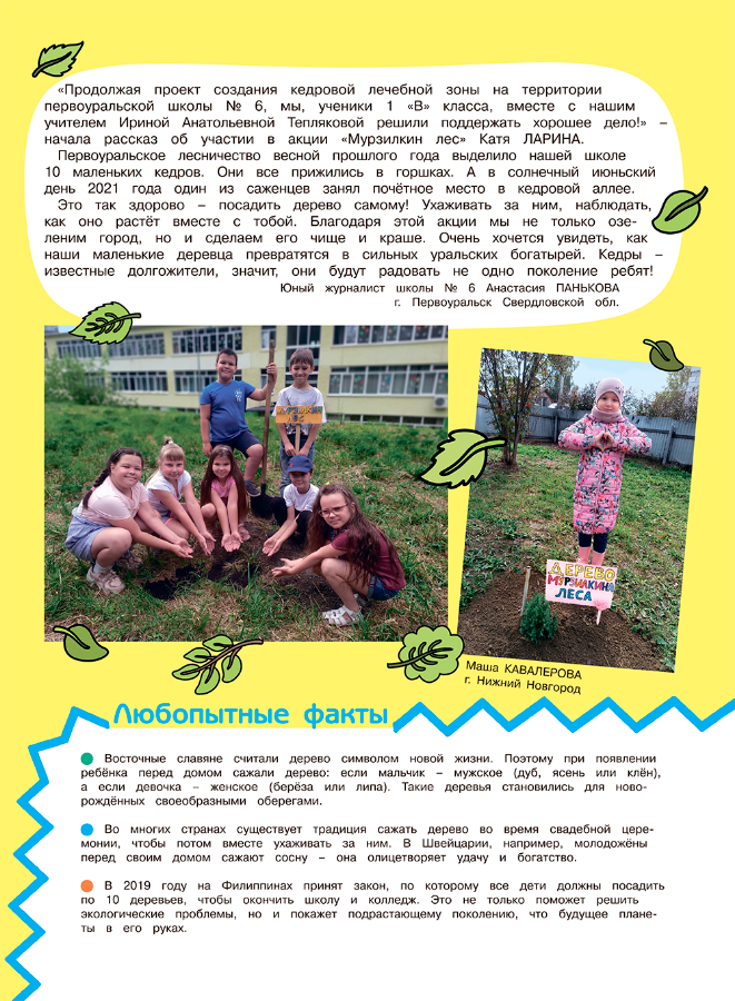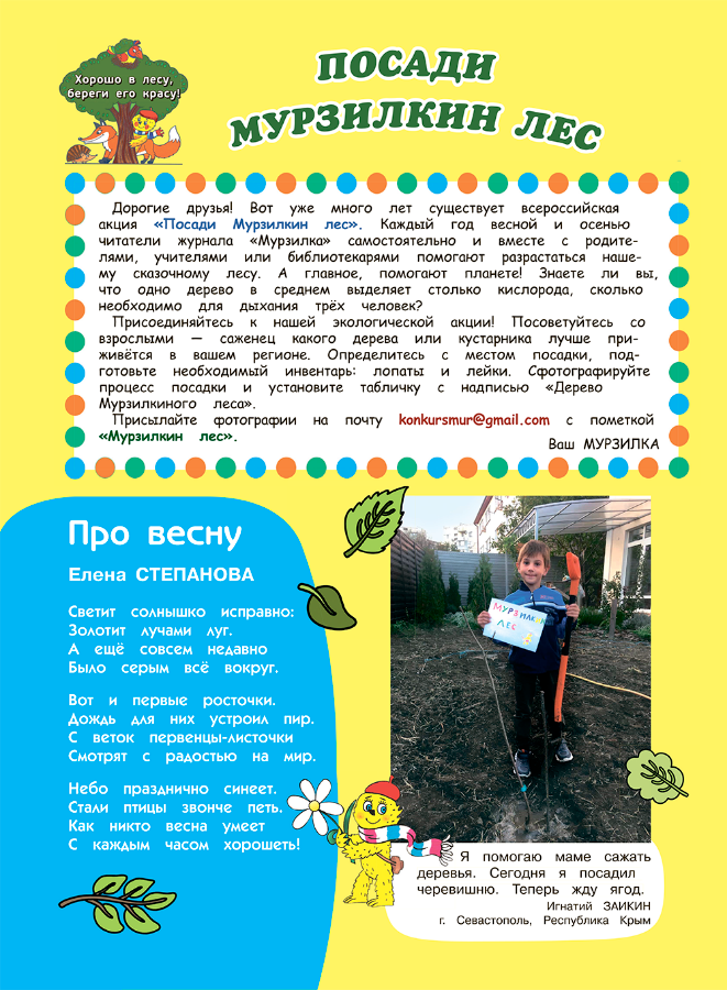 У нашего журнала есть свой собственный волшебный «Мурзилкин лес», который разрастается с каждым годом! Вы тоже можете принять участие в акции и посадить дерево «Мурзилкиного леса»: посоветуйтесь со взрослыми и найдите место для посадки – другие деревья и кустарники не должны мешать саженцу расти. Выбирайте те виды деревьев, которые уже растут в вашем регионе и хорошо приживутся. Помните, что в городе сажать деревья могут только специальные службы. А вот на даче, в деревне вы можете посадить дерево и сами. Дождитесь подходящей погоды, подготовьте лопаты, лейки, саженцы – и вперёд! – сажать Мурзилкин лес! Сфотографируйте процесс посадки и установите табличку с надписью «Дерево Мурзилкиного леса». Присылайте фотографии на почту contest@murzilka.org с пометкой «Мурзилкин лес».