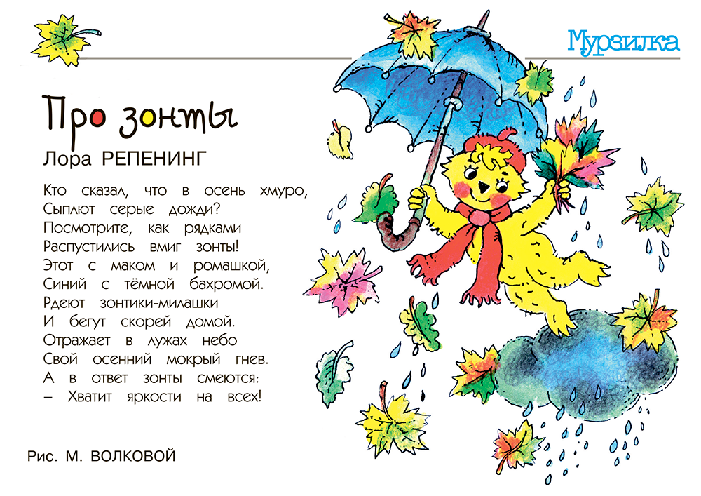 Новости День разноцветных зонтов Как говорится: «У природы нет плохой погоды»! И даже в дождливый день можно найти что-то хорошее. Например, полюбоваться разноцветными зонтами, которые наполняют серый пейзаж яркими красками! «Мурзилка» № 10 2015 г. Поделиться Добавить комментарий