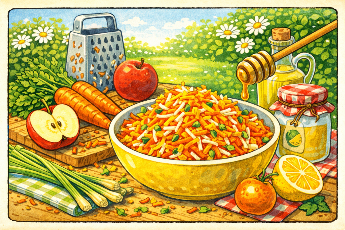 Натри морковь и яблоко на тёрке, добавь немного сока и мёда и перемешай.