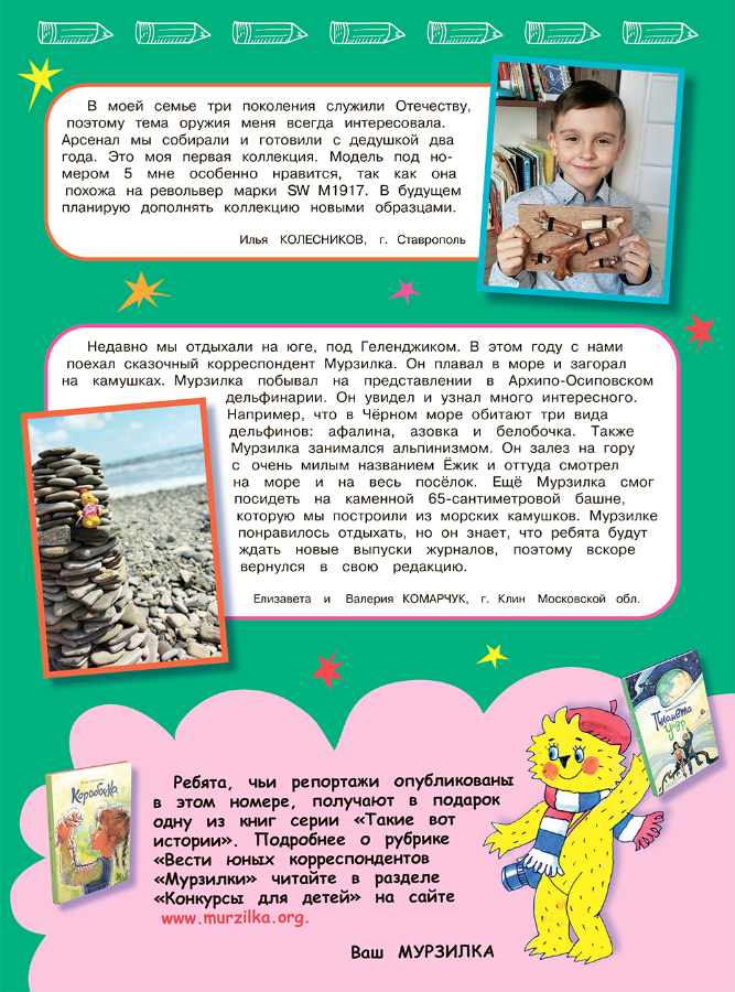 На странице конкурса выбирайте, какое задание хотите выполнить, готовьте свои краткие репортажи (до 15 предложений) с фотографиями и присылайте их в редакцию журнала «Мурзилка»!